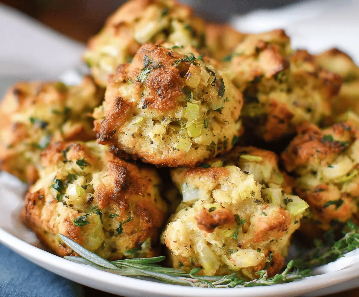 These turkey stuffing balls are a tasty twist on traditional stuffing! Packed with savory turkey, herbs, and tasty bread, they are crispy on the outside and fluffy inside.