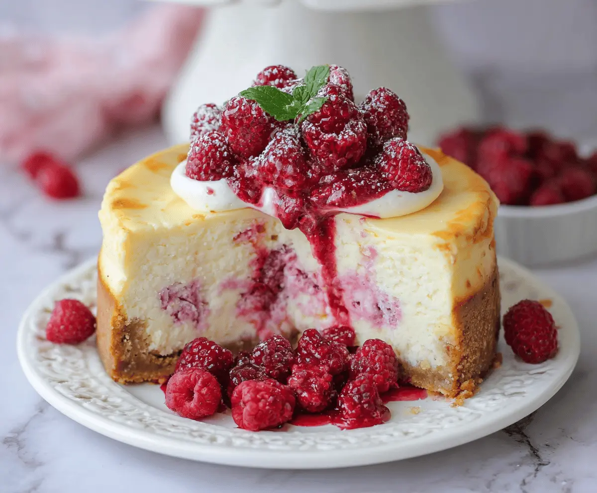 Once your cheesecake is completely chilled, carefully remove it from the springform pan. Delightfully drizzle the raspberry sauce generously over the top and sides. Pile fresh raspberries on top for a beautiful finish and garnish with mint leaves if you like.